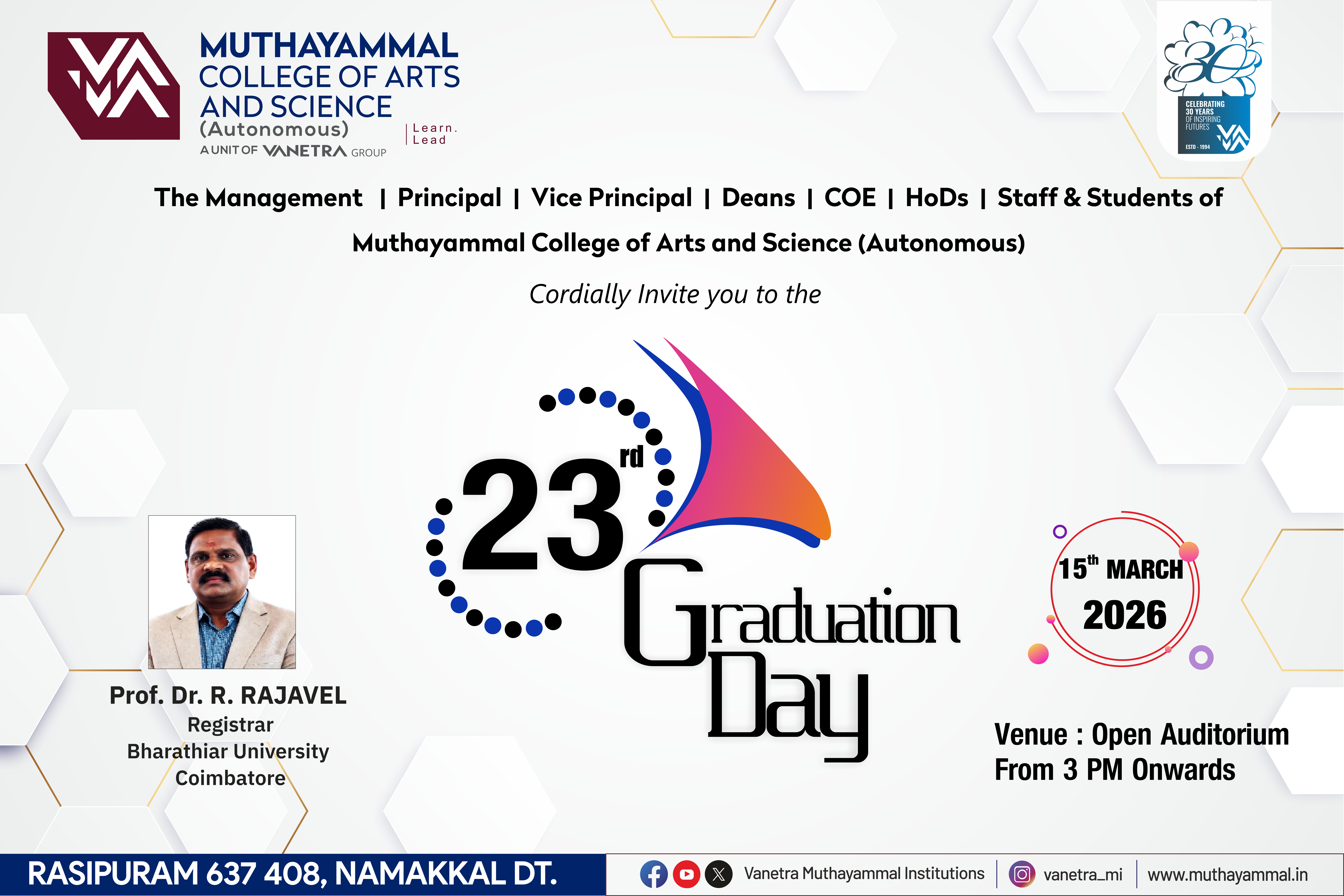 - Dr.R.SelvakumaranIt gives me immense pleasure to welcome you all to the eminent Muthayammal College of Arts and Science which was established in 1994.The college has been rendering service to the rural community for 31 years. The college has been accredited with NAAC “A” Grade. It enjoys 2 (F) & 12(B) status. Department of Biotechnology (DBT) and Ministry of Science and Technology recognized our College with “STAR SCHEME” cap and five Departments- Computer Science, Biotechnology, Biochemistry, Microbiology, Chemistry have been sheltered under the star scheme. MCAS has been Awarded with FIST-DST (Department of Science and Technology).