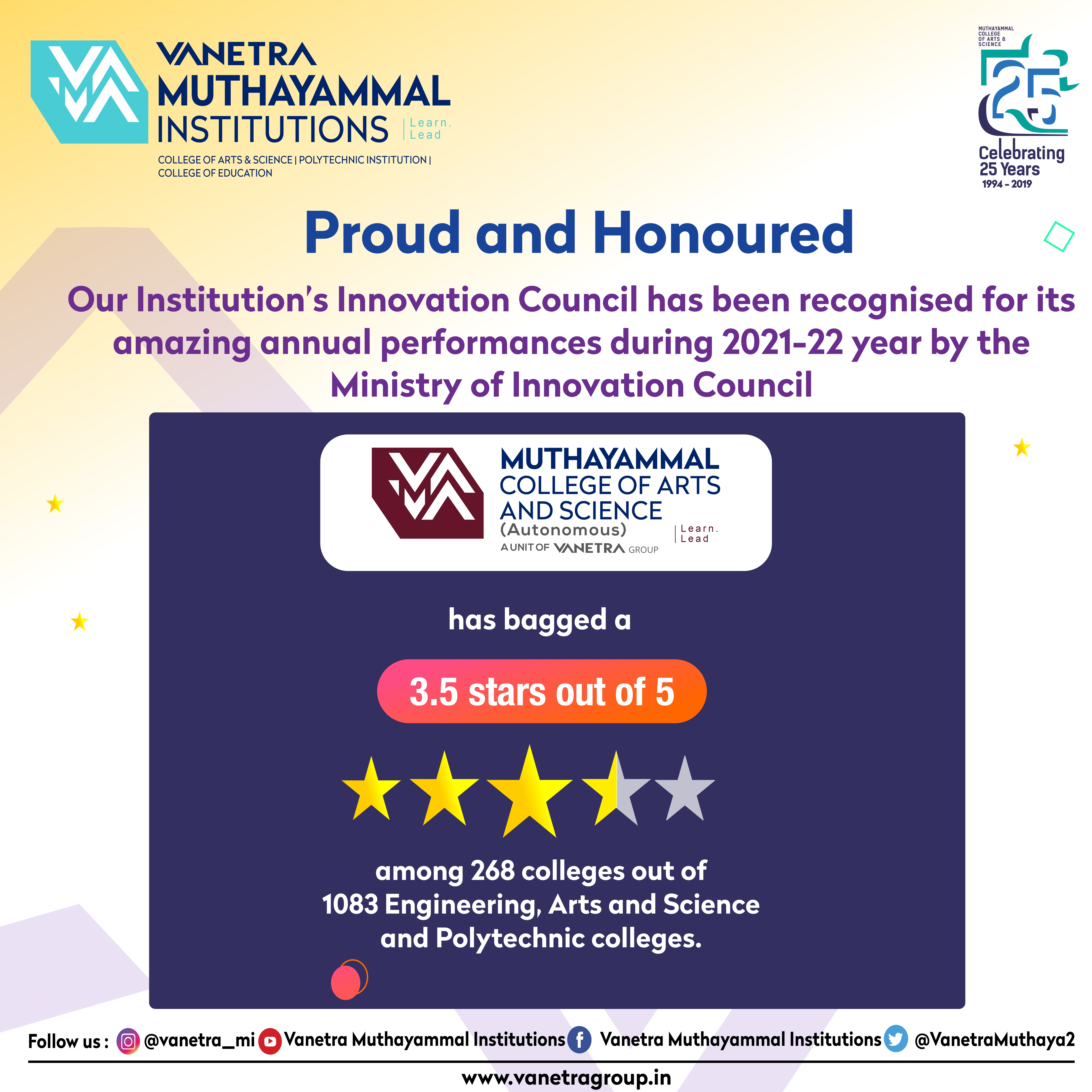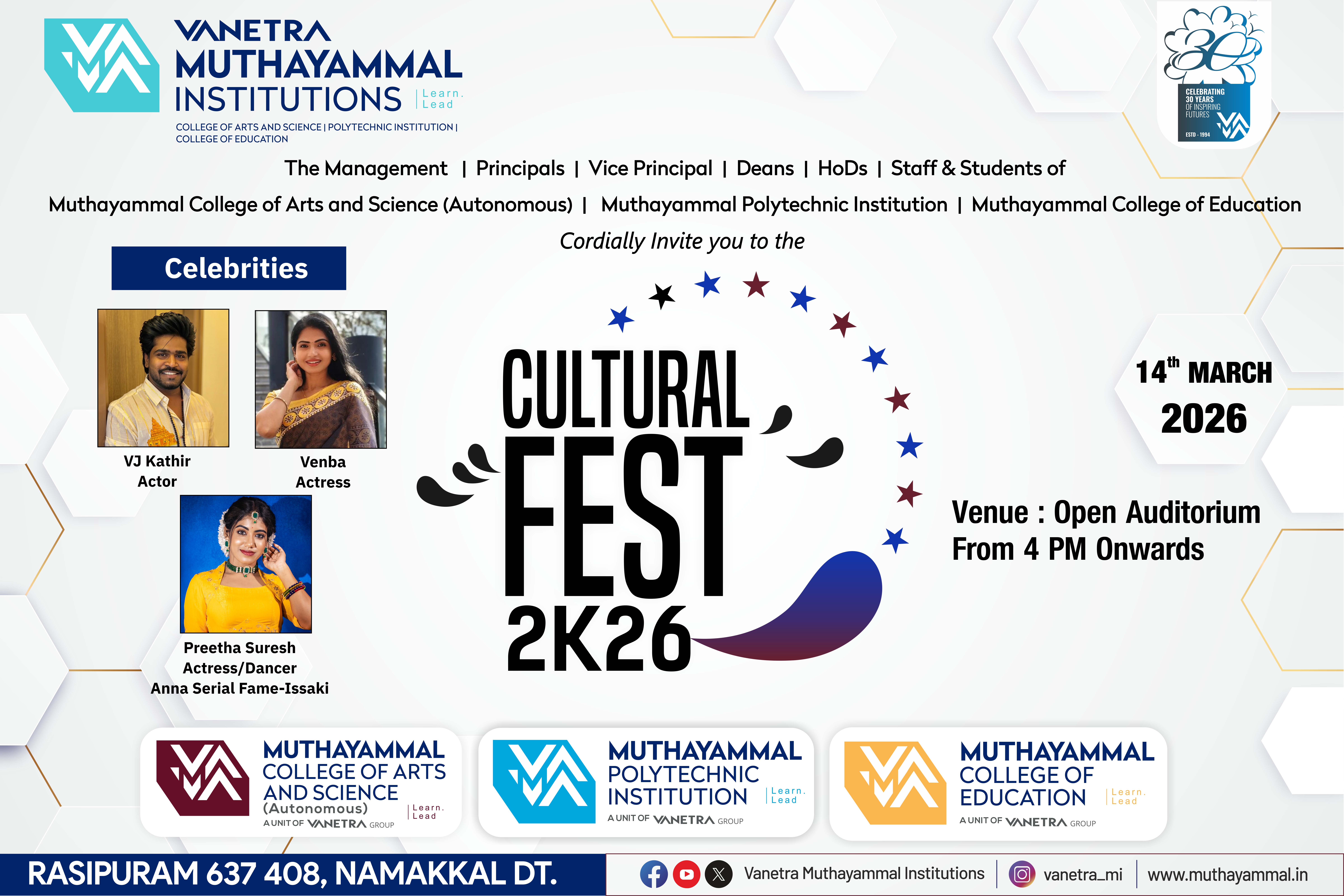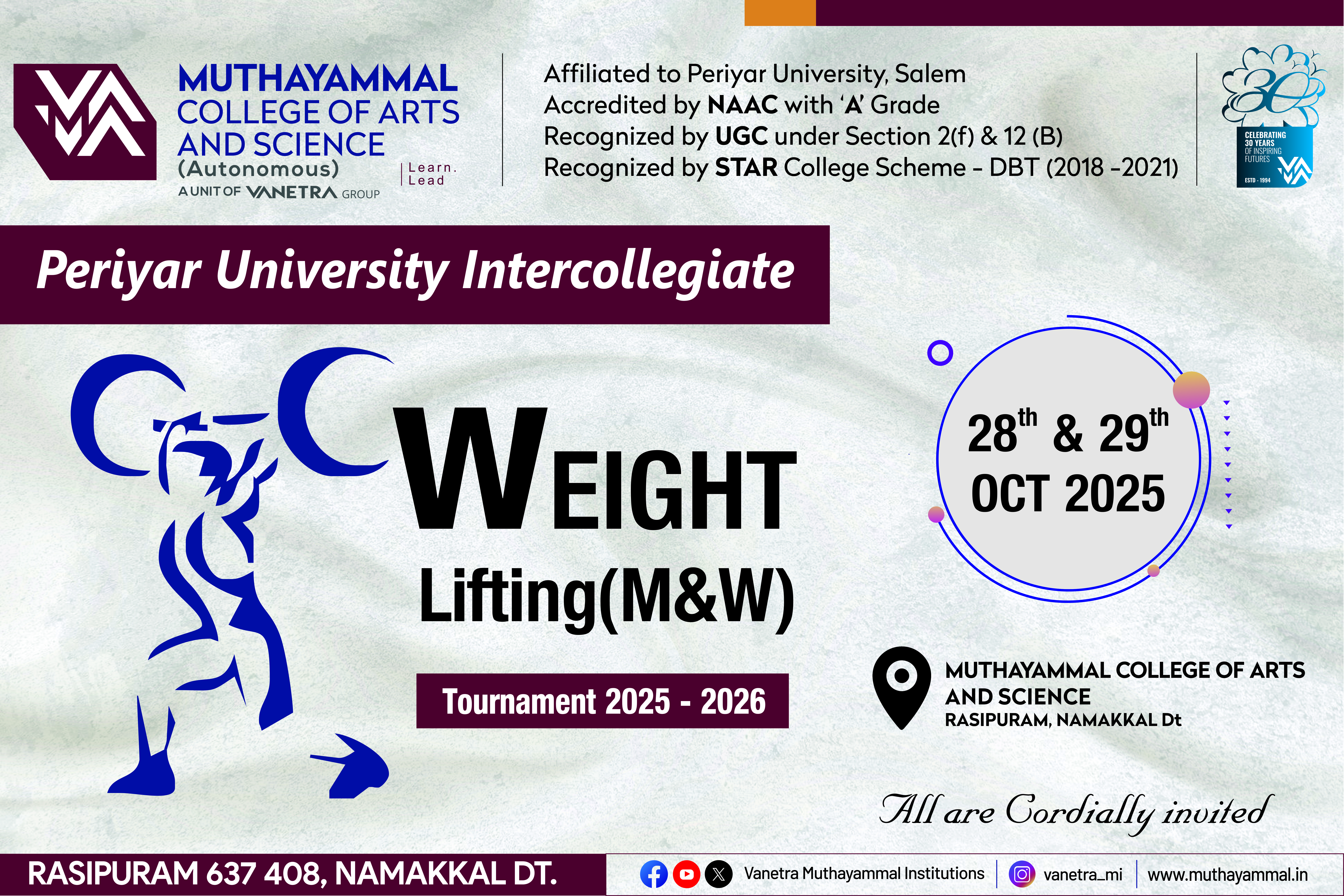 - Dr.R.SelvakumaranIt gives me immense pleasure to welcome you all to the eminent Muthayammal College of Arts and Science which was established in 1994.The college has been rendering service to the rural community for 31 years. The college has been accredited with NAAC “A” Grade. It enjoys 2 (F) & 12(B) status. Department of Biotechnology (DBT) and Ministry of Science and Technology recognized our College with “STAR SCHEME” cap and five Departments- Computer Science, Biotechnology, Biochemistry, Microbiology, Chemistry have been sheltered under the star scheme. MCAS has been Awarded with FIST-DST (Department of Science and Technology).