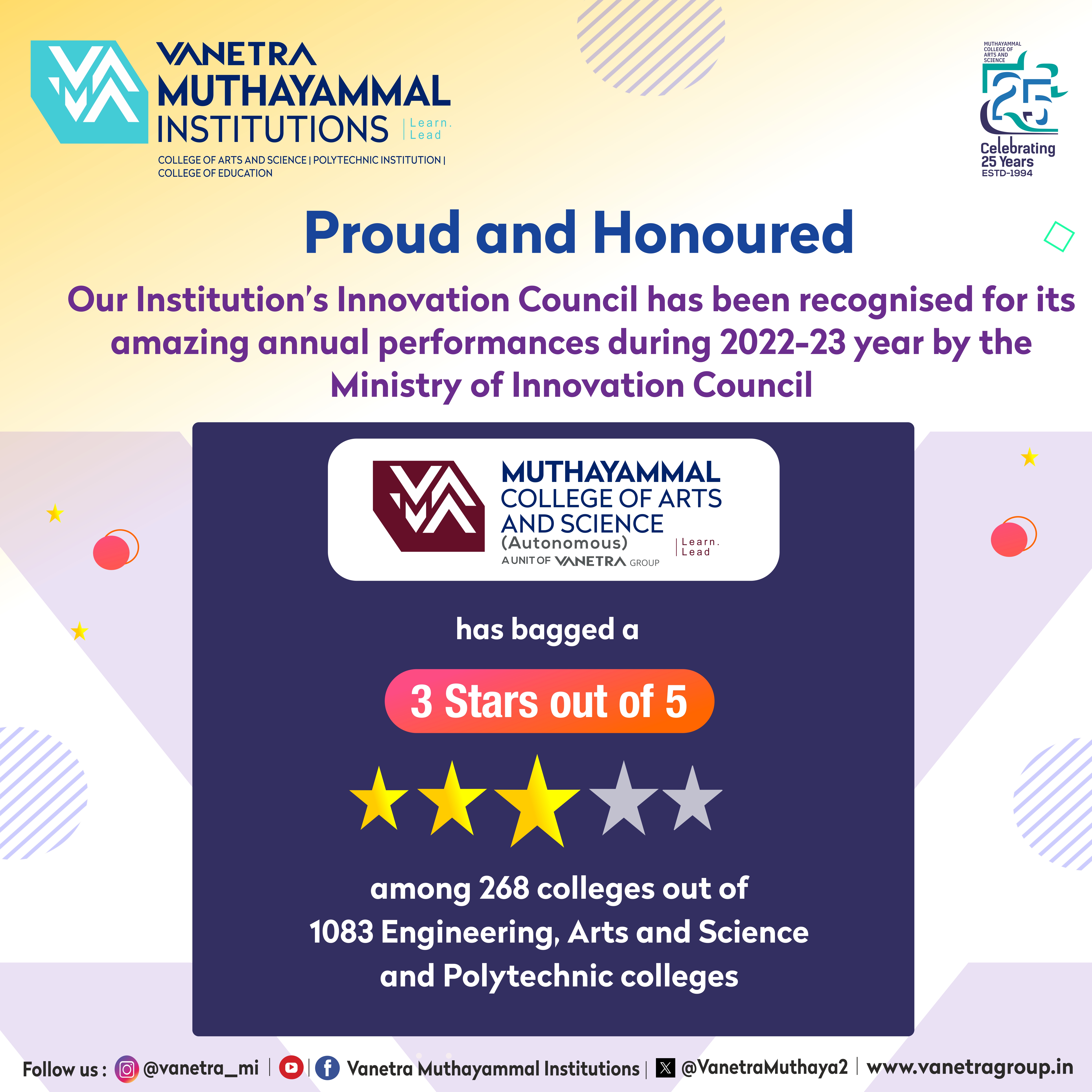 Founded in 1994, Muthayammal College of Arts & Science has emerged as an institution of fine learning. The basic tenets of education that govern the college are embodied in the words "education for all". In the years since its inception, hundreds of rural students have been able to explore better options and achieve high degrees of success.