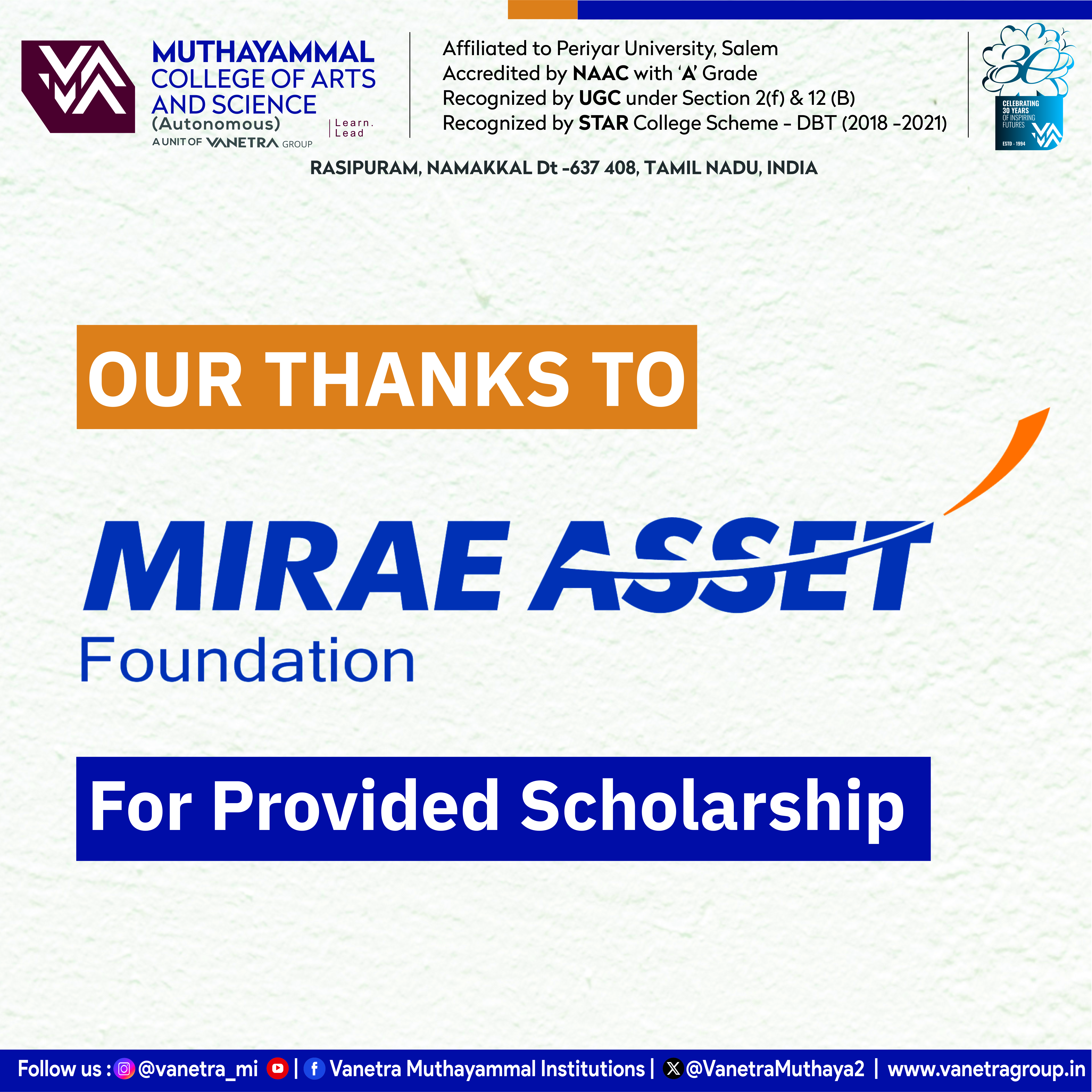 - Dr.R.SelvakumaranIt gives me immense pleasure to welcome you all to the eminent Muthayammal College of Arts and Science which was established in 1994.The college has been rendering service to the rural community for 31 years. The college has been accredited with NAAC “A” Grade. It enjoys 2 (F) & 12(B) status. Department of Biotechnology (DBT) and Ministry of Science and Technology recognized our College with “STAR SCHEME” cap and five Departments- Computer Science, Biotechnology, Biochemistry, Microbiology, Chemistry have been sheltered under the star scheme. MCAS has been Awarded with FIST-DST (Department of Science and Technology).
